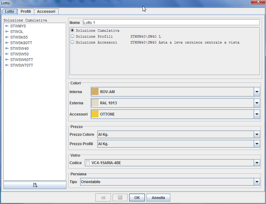 In questa pagina, è possibile dare un nome al nuovo lotto, scegliere il colore da assegnare ai profili, interni ed esterni (es. allumio-legno) e agli accessori, che tipo di vetro e persiana inserire, come calcolare i prezzi di profili e colori.